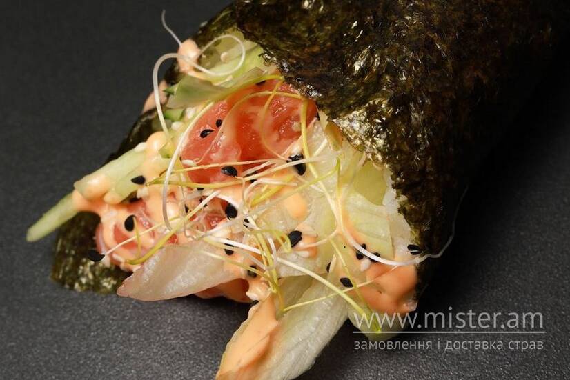 Рис, крем-сир Філадельфія, лосось, огірок або авокадо, соус Спайсі, айсберг, норі, кунжут.