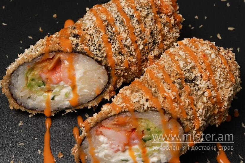 Рис, крем-сир Філадельфія, креветка, огірок, айсберг, соус Крем-Чилі, норі, мигдалеві пластівці.