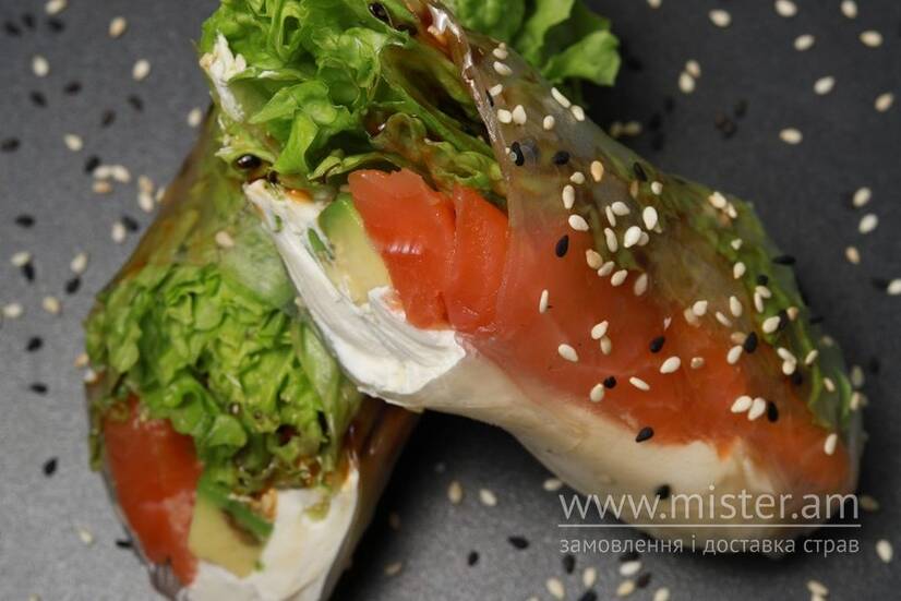 Рисовий папір, крем-сир Філадельфія, лосось, огірок або авокадо, соус Унагі, кунжут, листя салату, ікра.