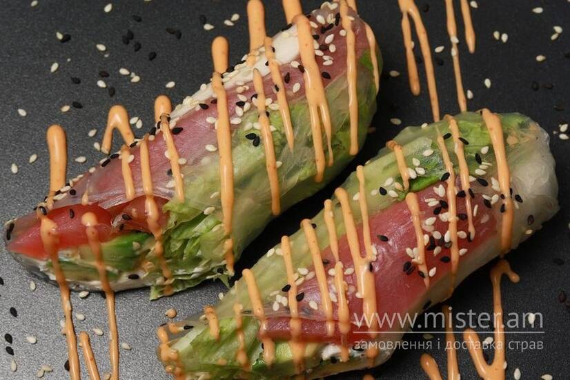 Рисовий папір, крем-сир Філадельфія, тунець, огірок або авокадо, соус Спайсі, норі, кунжут, листя салату, ікра.