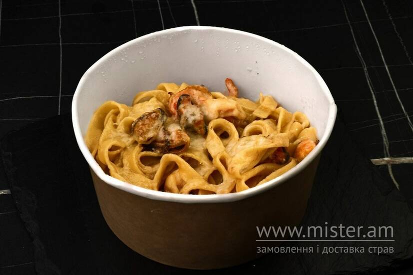 Фетучіні, креветка, мідії, вершки, пармезан.
