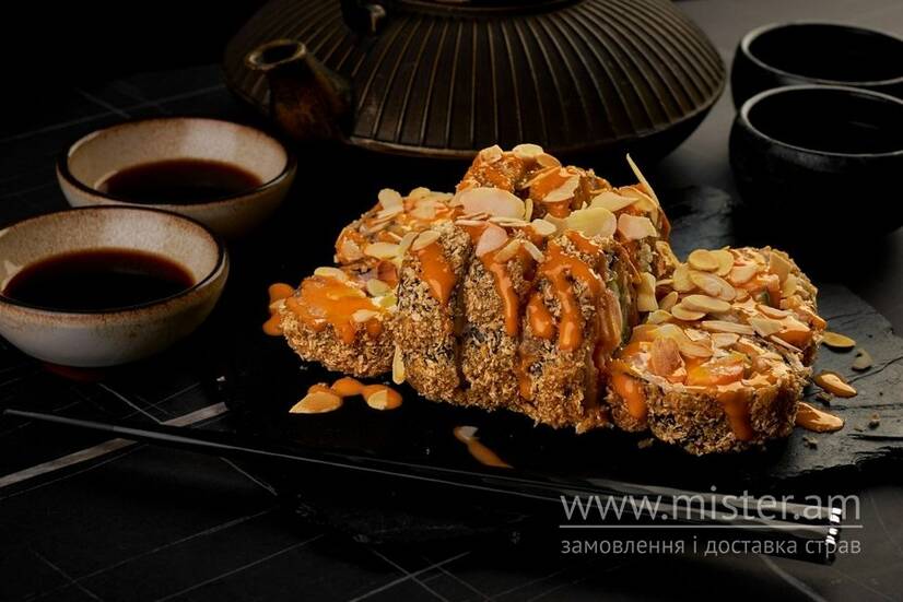 Рис, лосось, апельсин, крем-сир Філадельфія, листя салату, соус Крем-чилі, мигдалеві пластівці, норі.