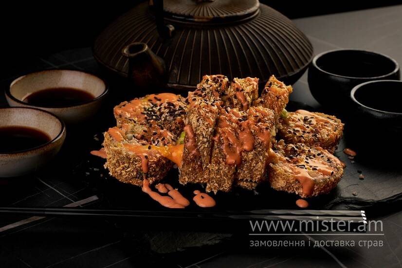 Рис, лосось теріякі, крем-сир Філадельфія, чеддер, огірок, соус Ням, кунжут, норі.