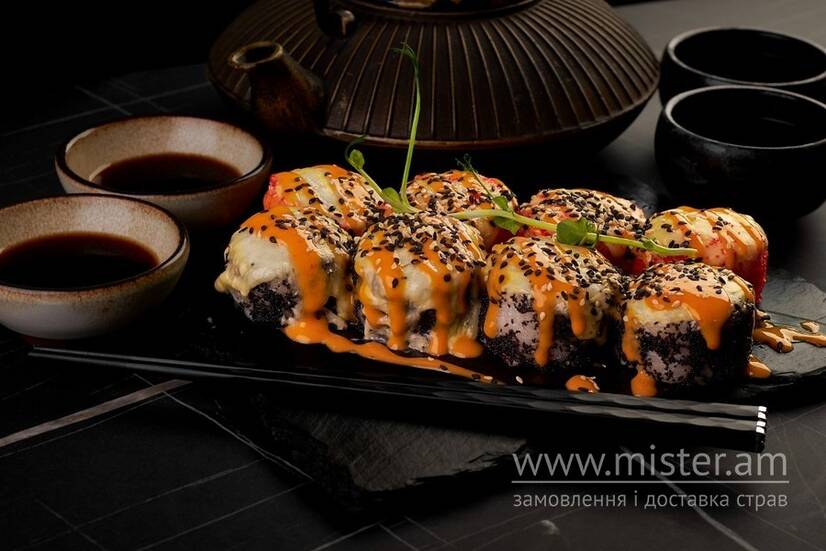 Рис, креветка, крем-сир Філадельфія, огірок, ікра, сирний мікс, соус Крем-чилі, норі.