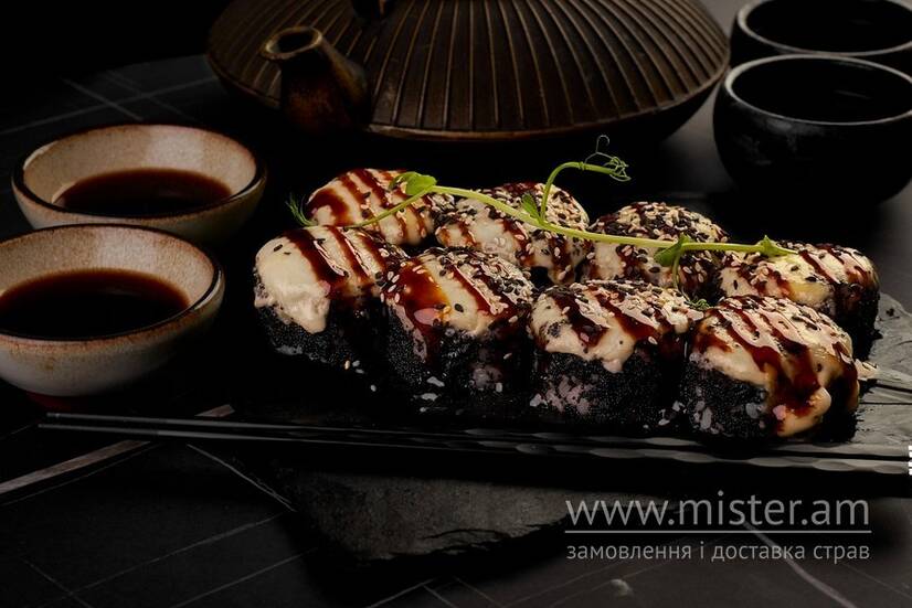 Рис, тунець, крем-сир Філадельфія, огірок, ікра, сирний мікс, соус Унагі, кунжут, норі.