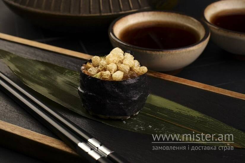Вугор, кранч, авокадо, норі, соус Унагі.