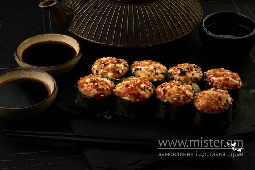 Рис, крем-сир Філадельфія, огірок, соус Унагі, кунжут, ікорний заміс.