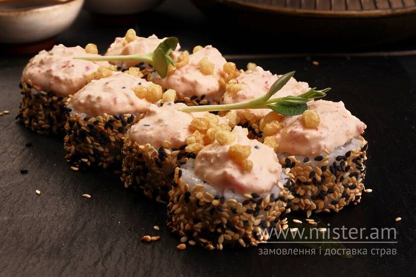 Рис, крем-сир Філадельфія, огірок, норі, сніжний краб, кунжут.