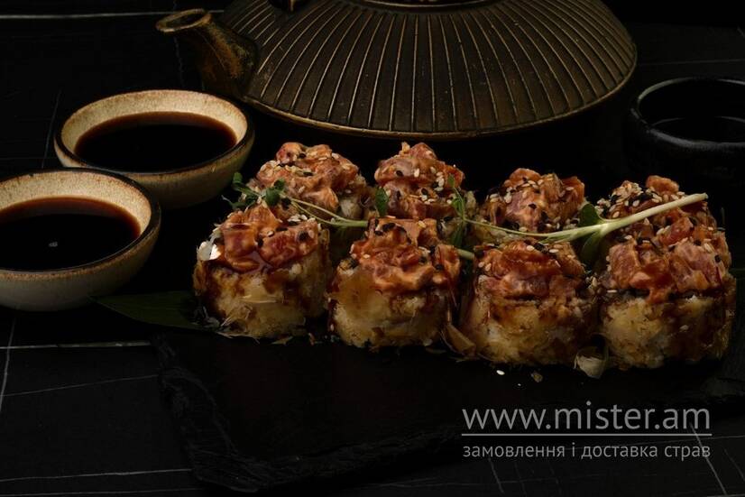 Рис, норі, крем-сир Філадельфія, огірок, тунець, соус Спайсі, стружка тунця, соус Унагі, кунжут.