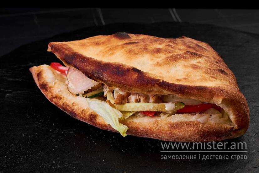 Курка, айсберг, помідори, огірок, бекон, пармезан, соус Цезар.