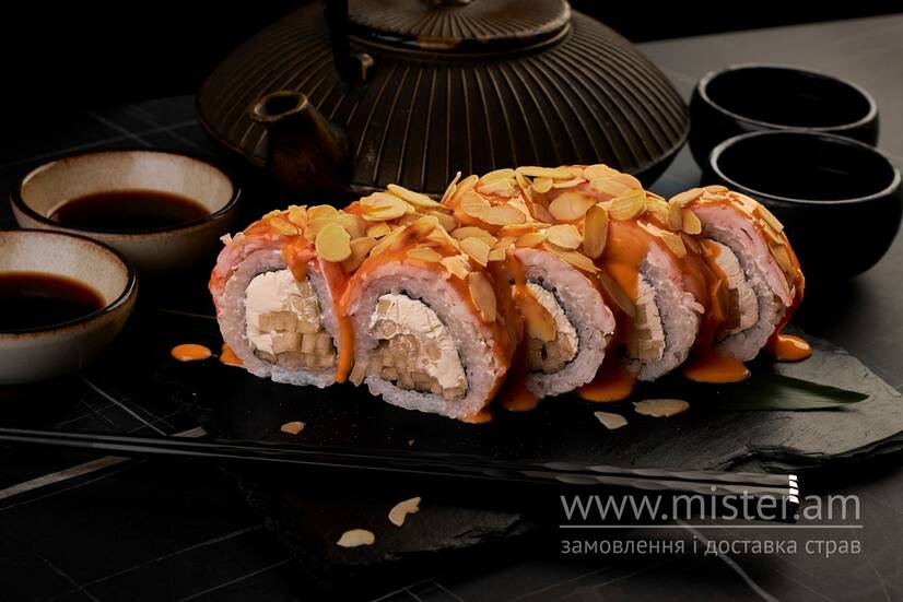 Рис, креветка, крем-сир Філадельфія, груша, соус Крем-Чилі, норі.