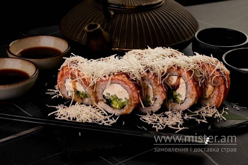 Рис, норі, крем-сир Філадельфія, авокадо, лосось, пармезан.