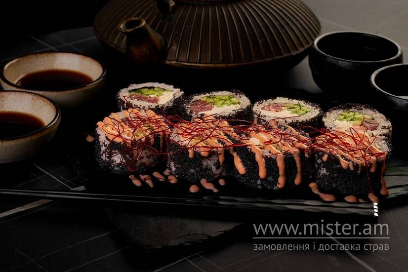 Рис, норі, крем-сир Філадельфія, тунець, ікра, огірок, соус Ням, нитки чілі.