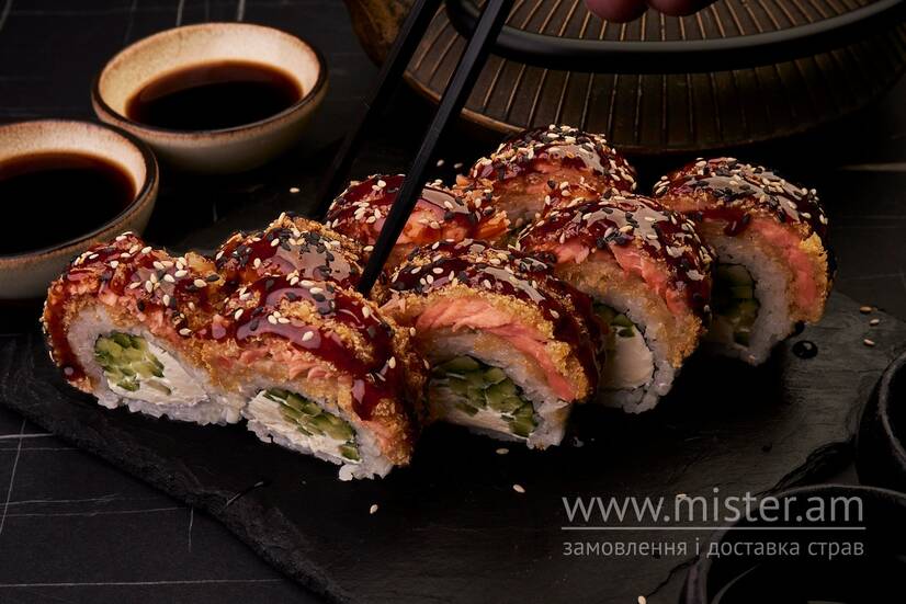 рис, норі, лосось, крем-сир Філадельфія, огірок, соус Унагі, кунжут.