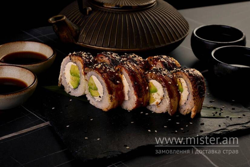 Рис, вугор, крем-сир Філадельфія, авокадо, соус Унагі, норі.