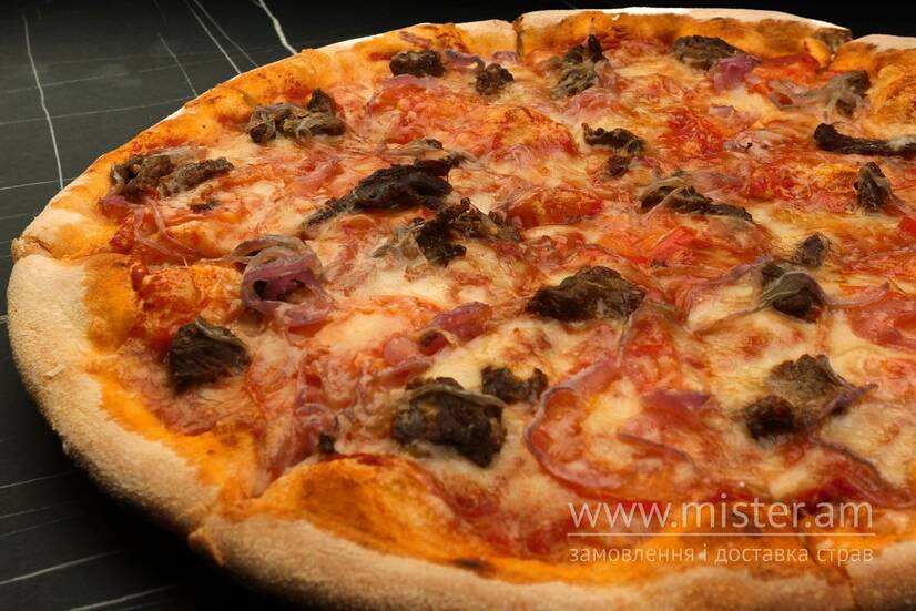 Моцарела, соус томатний, телятина, цибуля, пармезан.