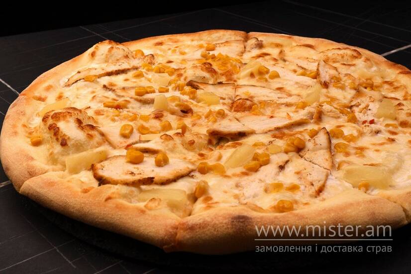 Моцарела, соус вершковий, курка, ананас, кукурудза.