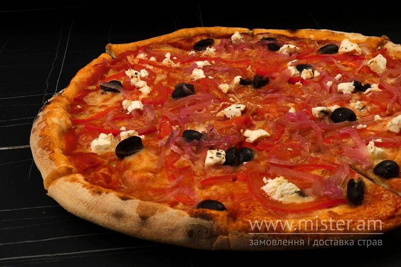 Моцарела, соус томатний, фета, перець болгарський, цибуля, маслини.