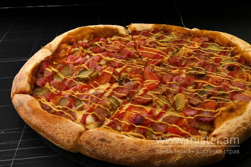 Моцарела, соус BBQ, мисливські ковбаски, помідор, огірок маринований, цибуля, гірчиця, кетчуп.