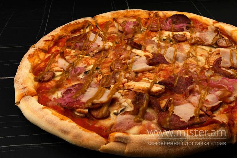 Моцарела, соус томатний, салямі, шинка, мисливські ковбаски, курка, бекон, гриби, цибуля, соус часниковий.