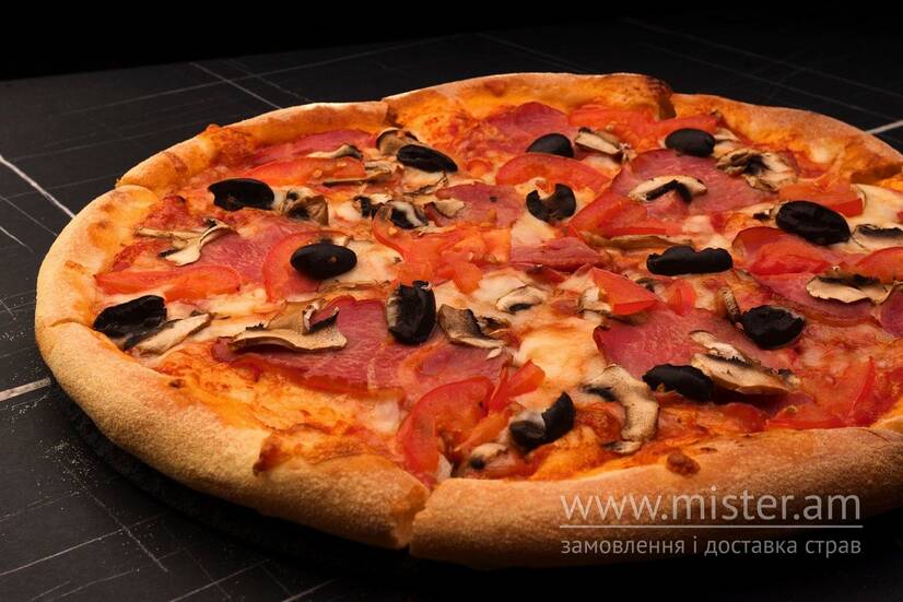 Моцарела, соус томатний, шинка, гриби, помідор, маслини.