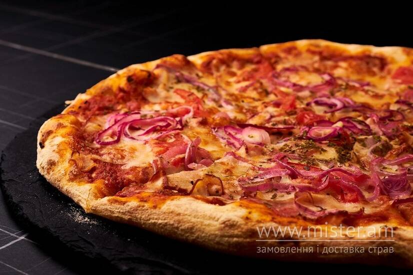 Моцарела, соус томатний, бекон, цибуля синя, шинка, помідор.