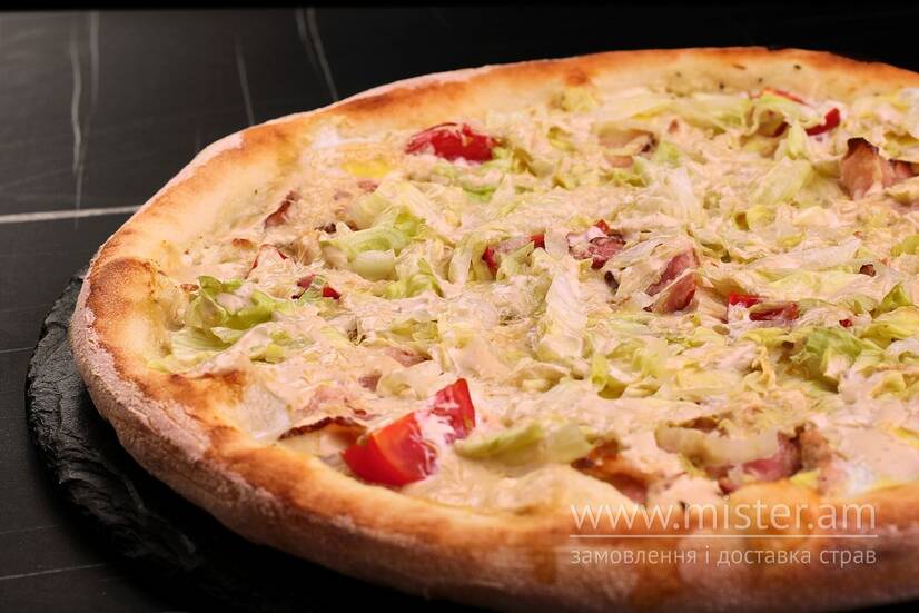 Моцарела, соус вершковий, курка, бекон, черрі, соус Цезар, салат айсберг, сир пармезан, перепелині яйця.