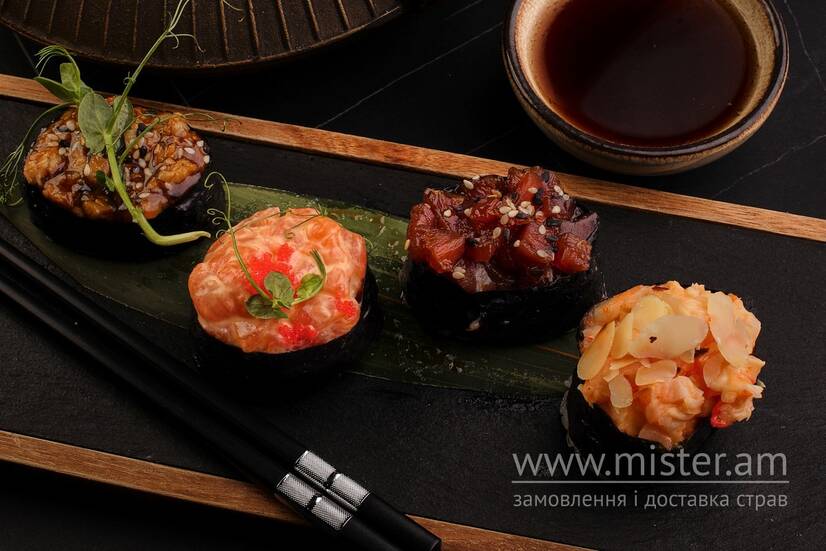 Гункан з креветкою, гункан з вугрем, гункан з тунцем, гункан з лососем.