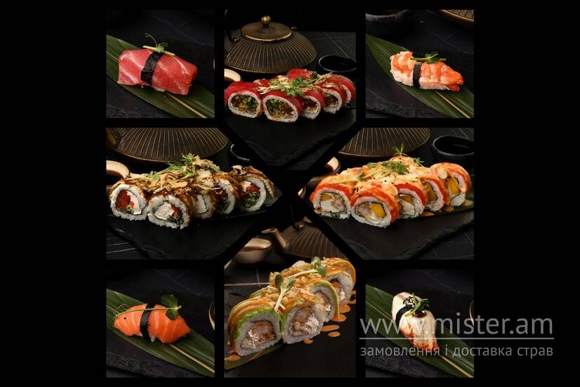 Дракон лосось-вугор, Дрокон лосось-креветка темпура, Дракон тунець-лосось теріякі, Зелений дракон, Нігірі: лосось,тунець, креветка, вугор.