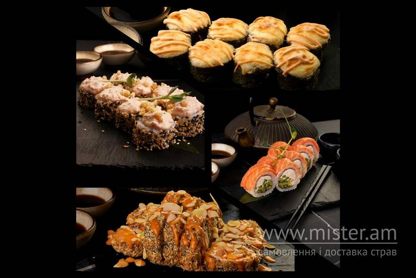 Філадельфія з лососем, Запечений з куркою, Смажений з креветкою, Крабовий бум.