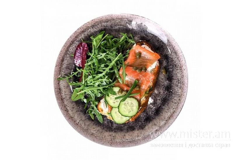 Чіабата, сир вершковий, соус песто, лосось, каперси, огірок, мікс салату, трюфельна заправка, цибуля зелена.