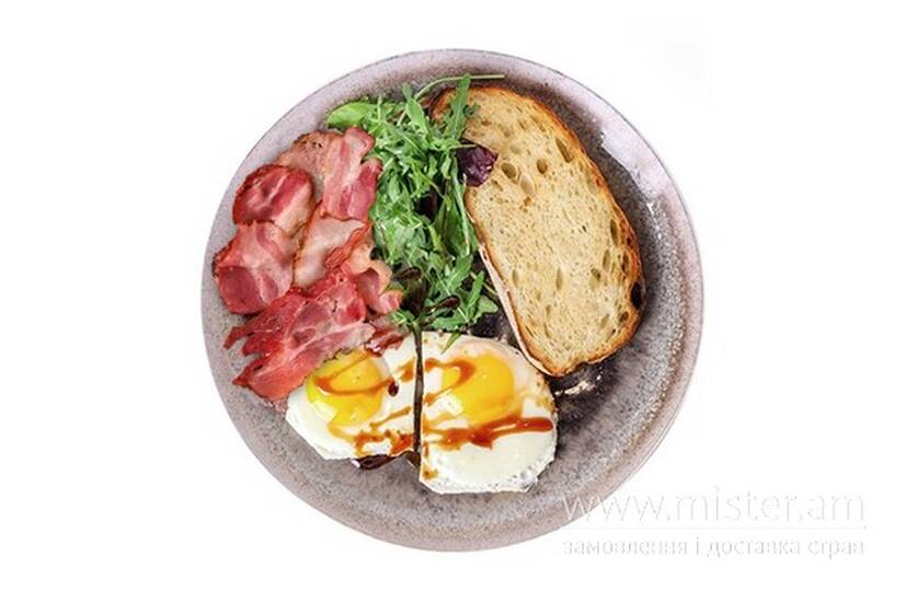 Яйце (2 шт.), чіабата, мікс салату, соус цитрусовий, бекон.