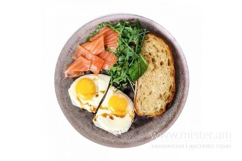 Яйце (2 шт.), чіабата, мікс салату, соус цитрусовий, лосось.