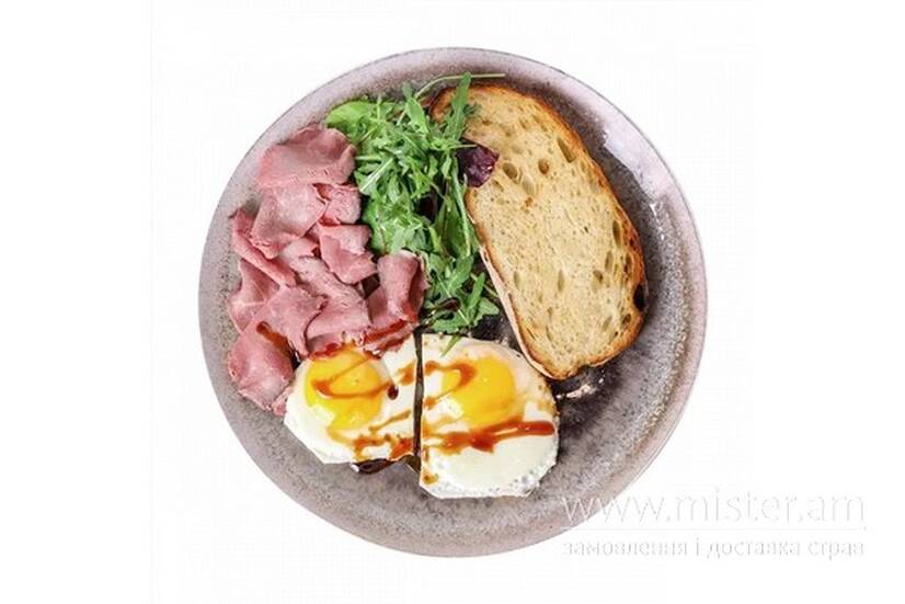 Яйце (2 шт.), чіабата, мікс салату, соус цитрусовий, ростбіф.