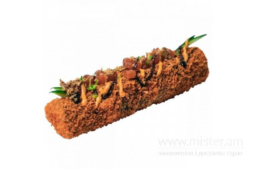 Норі, рис, сир вершковий, темпура, сухарі панко, соус унагі, огірок, лосось, соус спайсі, цибулеві крихти, цибуля зелена.