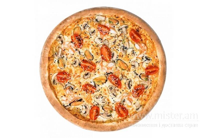 Моцарела, вершковий соус Том Ям, чері, гриби, мідії, креветки, кунжут.