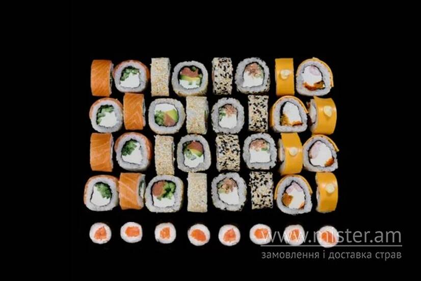 Філадельфія з огірком, рол Боніто з лососем, Філадельфія з лососем в кунжуті, рол Сирний з креветкою, Лосось макі.