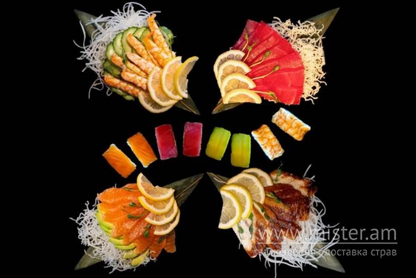 Сашимі лосось, Сашимі тунець, Сашимі креветка, Сашимі вугор, рол Райдужний.