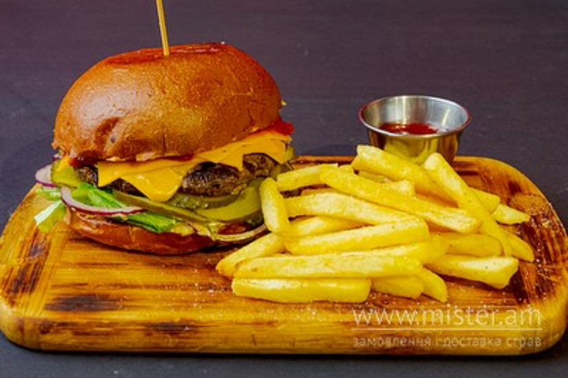 Булка біла, котлета яловича, соус гірчичний (майонез, гірчиця, цибуля червона), салат айсберг, огірок маринований, помідори,цибуля синя, сир Гауда, кетчуп томатний. Подається з картоплею.