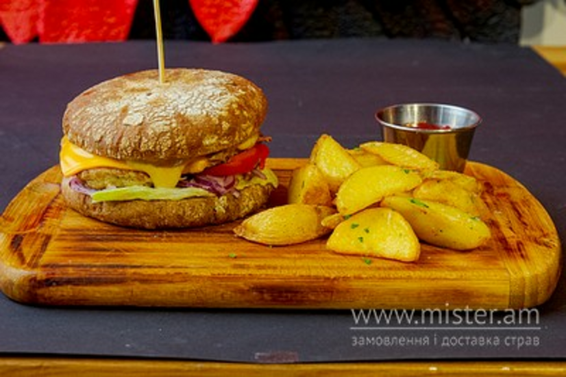 Булка зернова, котлета з курки, соус Цезар, салат айсберг, цибуля червона, помідори, сир чеддер. Подається з картоплею.
