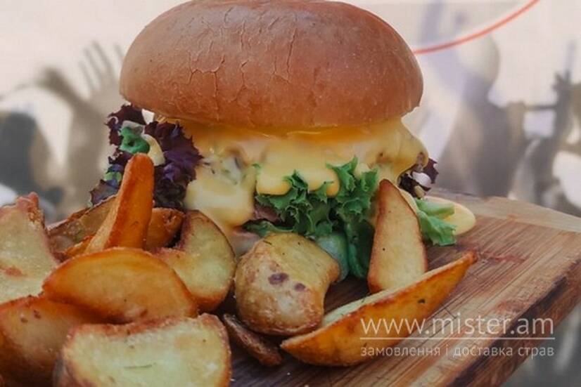 Бріош булка, карамелізована цибуля, подвійна котлета з яловичини, цибулевий кранч, салат айсберг, сирний соус, сир чеддер.