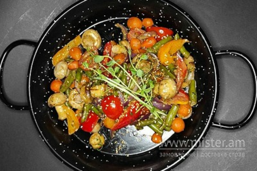 Бейбі морква, спаржа, перець болгарський, шампіньйони, цибуля червона, помідорки чері у вершковому соусі.