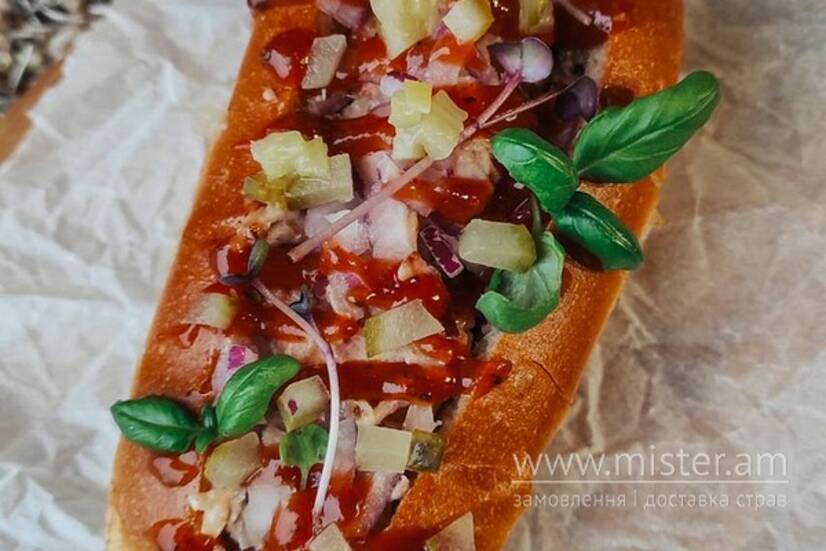 Булка бріош, рвана свинина зі смокера, маринований огірок.цибуля червона, соус томатіно, соус гірчичний, цибулевий кранч.