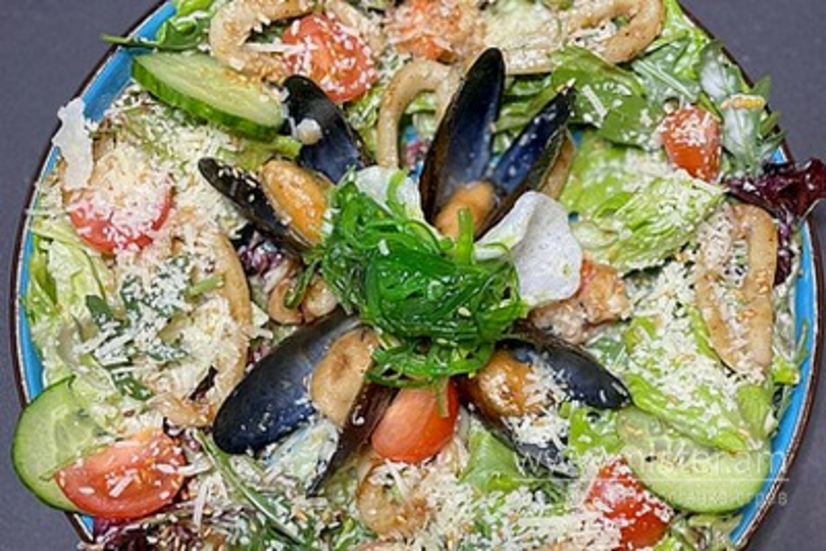 Мікс салату, помідори чері, мідії, кальмар, креветки, сир Пармезан, водорості чука, соус "гренадиновий".