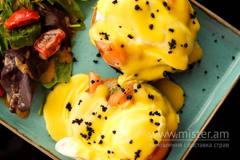 Яйця Бенедикт, лосось, авокадо, мікс салату, соус Голландез.
