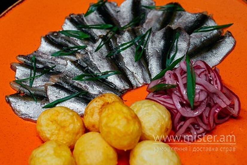 Маринована тюлька, молода картопля, цибуля.