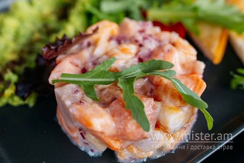 Сьомга, креветки тигрові, соус гуакамоле, оливкова олія, перець чилі, лайм, цибуля синя.