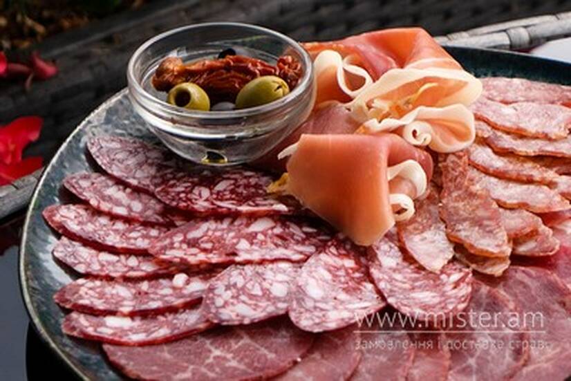 Хамон, фует, брезаола, копа, салямі конина, в`ялені томати, оливки, маслини.