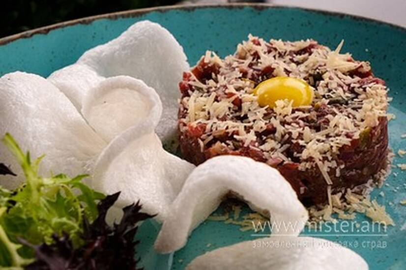 Телятина, каперси, пармезан, перепелиний жовток, чіпси з тапіоки, табаско.