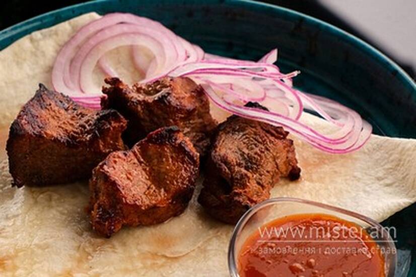 Стейк зі свиного ошийка, соус з перців, лаваш, цибуля синя, зелень.